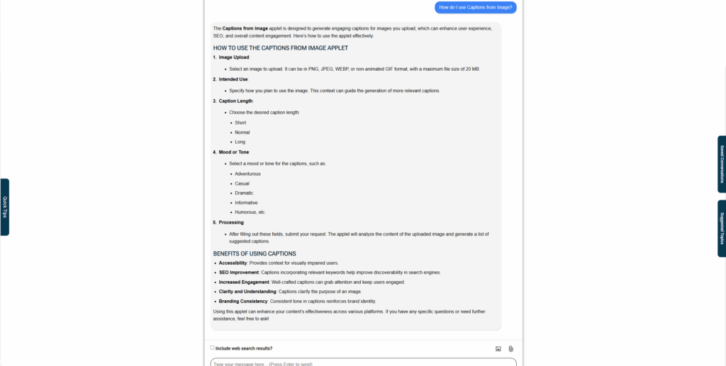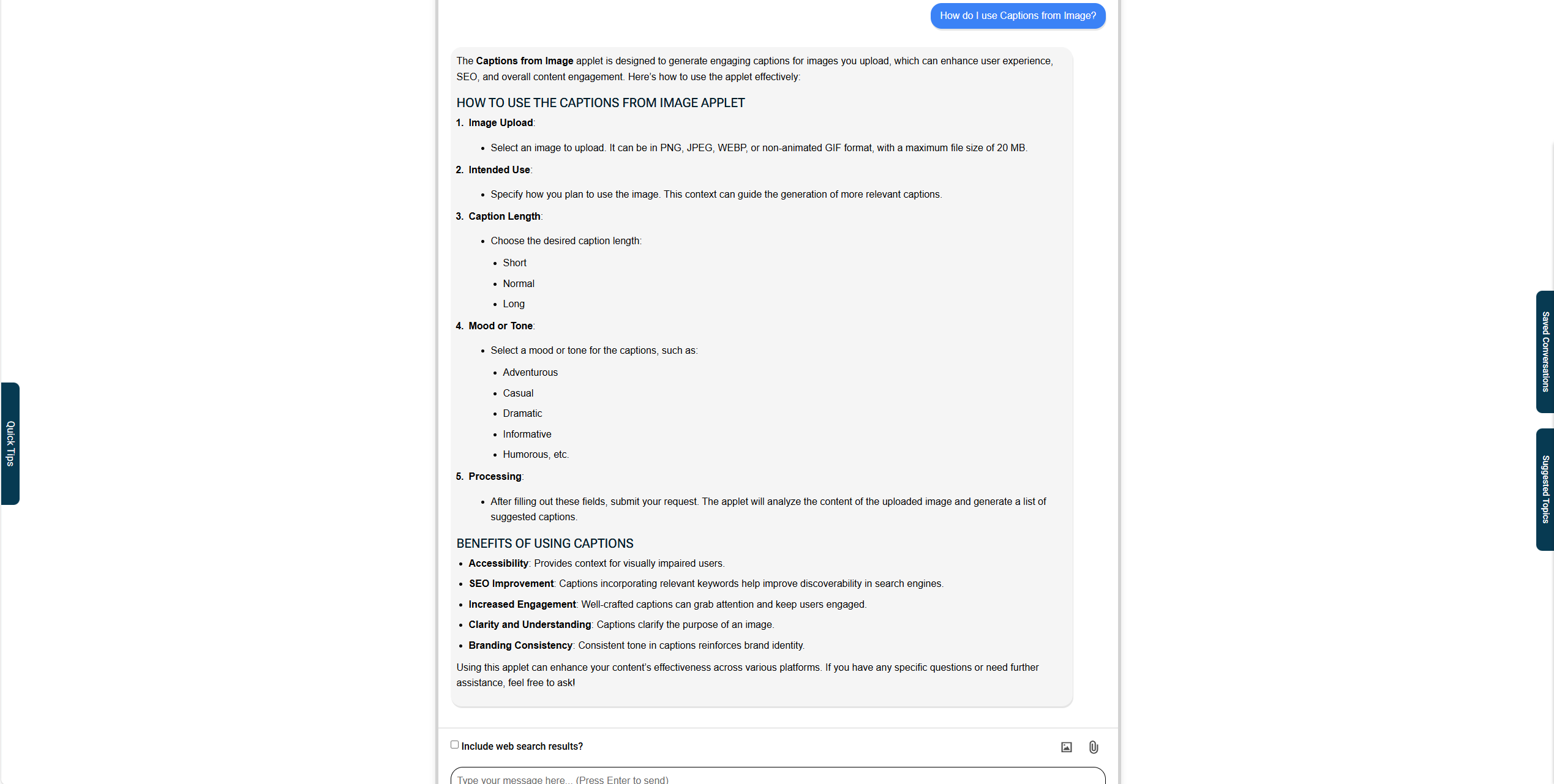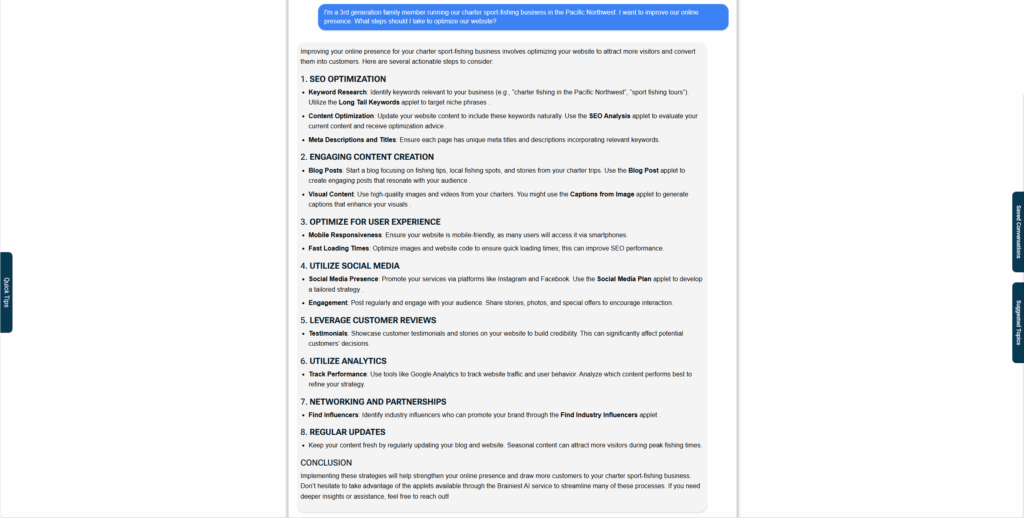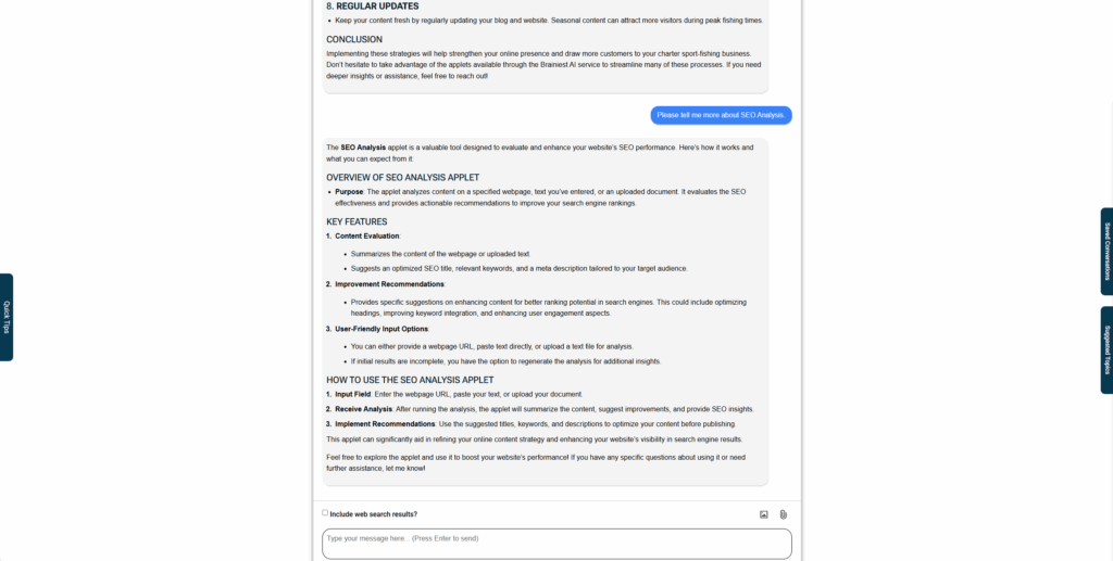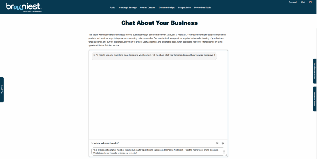 You may use Chat to brainstorm ideas for your business through a conversation with our Brainstorming AI-Assistant.  Help from Astro is available for guidance on using the applets and to answer general questions about our serviceResearch will help you quickly get a clear, concise response using the latest information available on the internet.