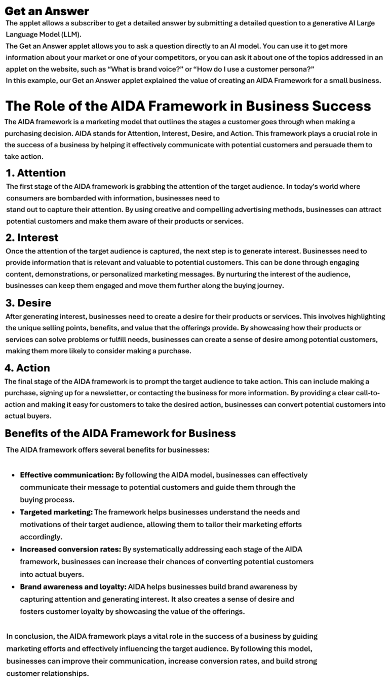 While other Large Language Models (LLMs) have learning cutoff dates from a year or more in the past, this model has access to the internet and will provide the latest information available. While you may ask it virtually any question, suggestions are included in the Applet Help sidebar. Keep in mind, you’ll get a better answer by including background information about your business.